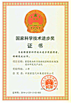 At the State Science and Technology Progress Awarding conference held in Great Hall of People in capital Beijing on January 9, the project “Efficient SCR technology R&D and industrialization of exhaust pollution control of heavy duty diesel vehicles” involved by Sinotruk received the second award of the State Science and Technology Progress Award. It is reported that this is the top award of scientific technology that Sinotruk has won since its restructuring program.