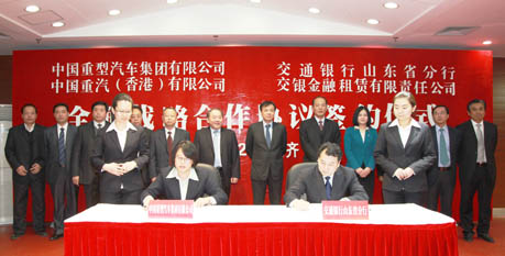 Wang Lei, vice president of BOCOM Shandong Branch and Wan Chunling, chief accountant of CNHTC; Li Ru, vice general manager of BOCOM Financial Leasing Co., Ltd. and Yu Youde, vice president of CNHTC signed the agreement on behalf of both sides respectively. Among the attendees was Kong Xiangquan, financial controller of CNHTC.